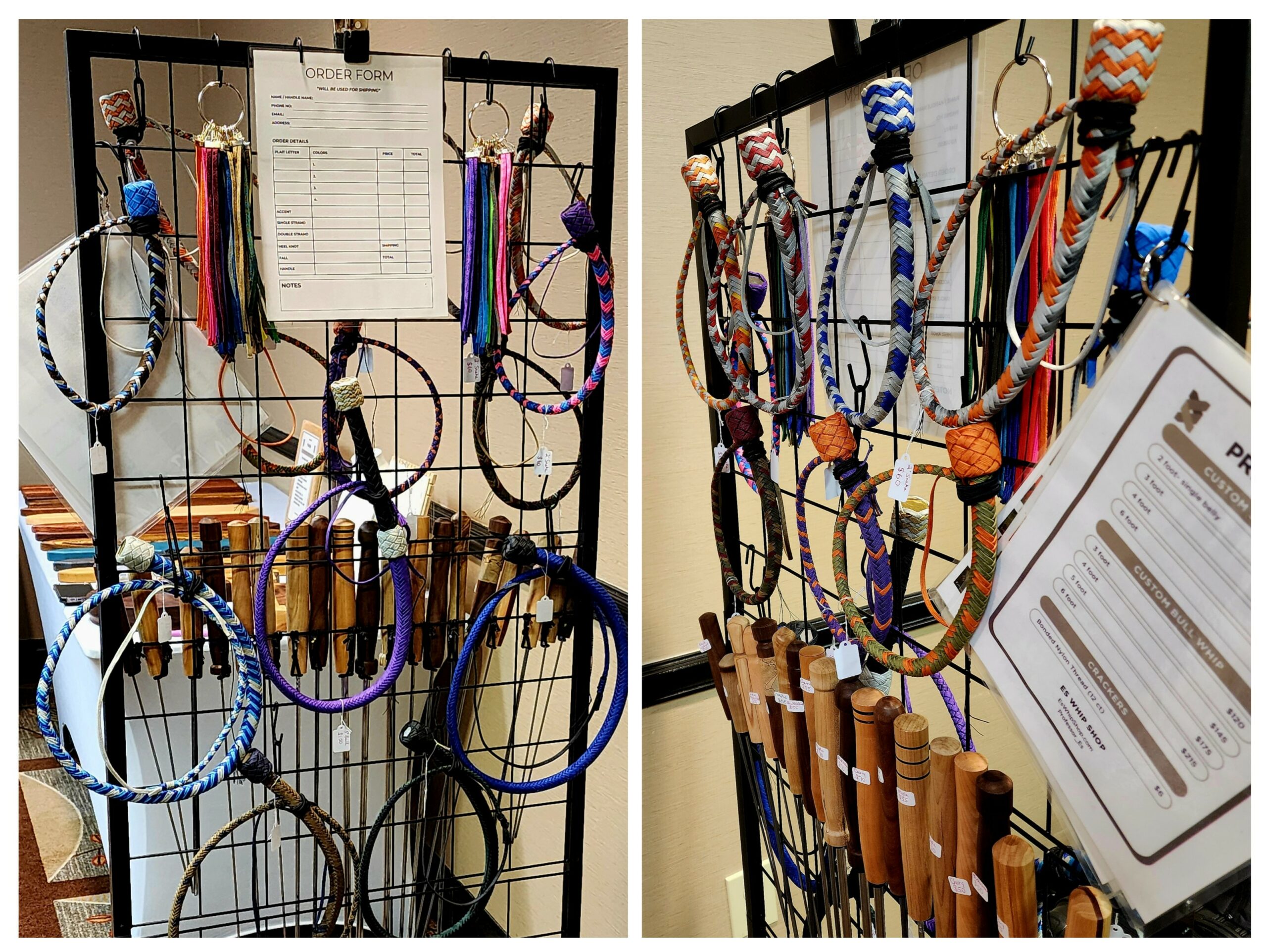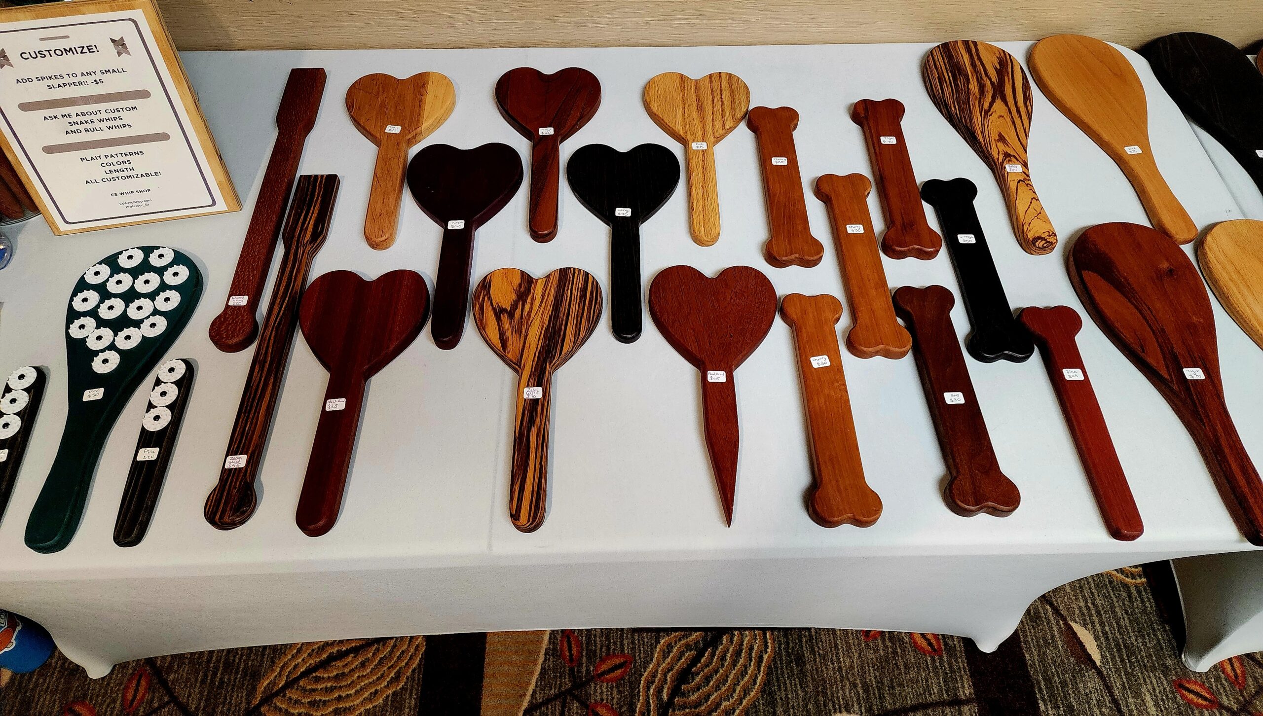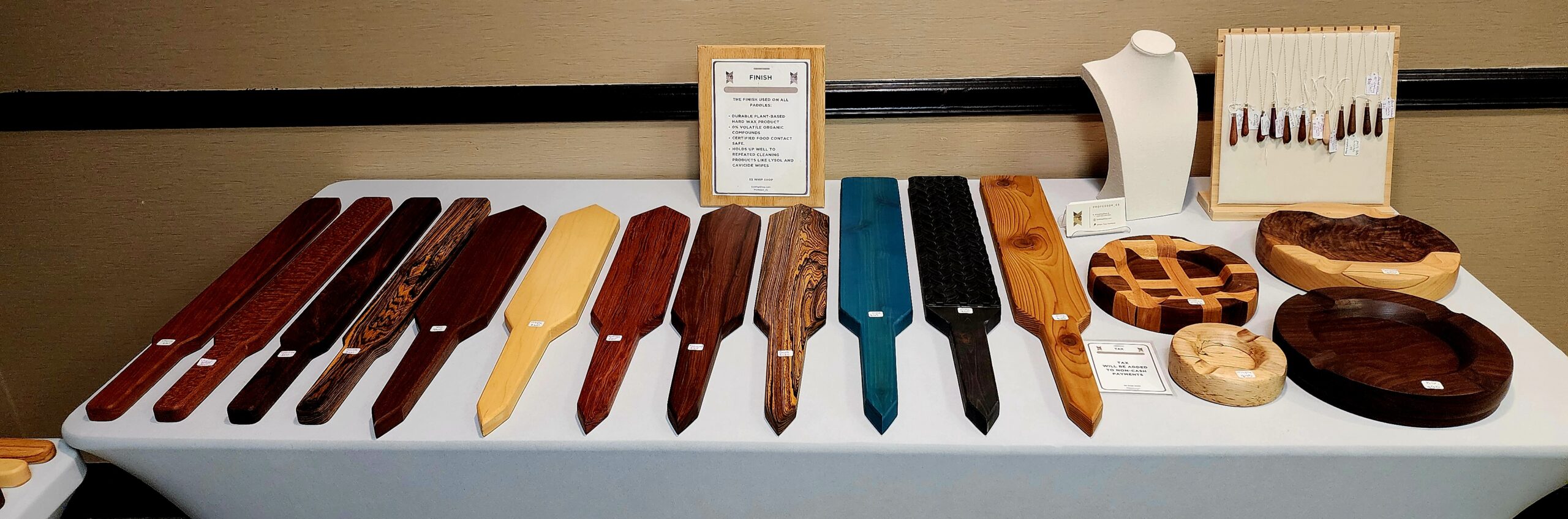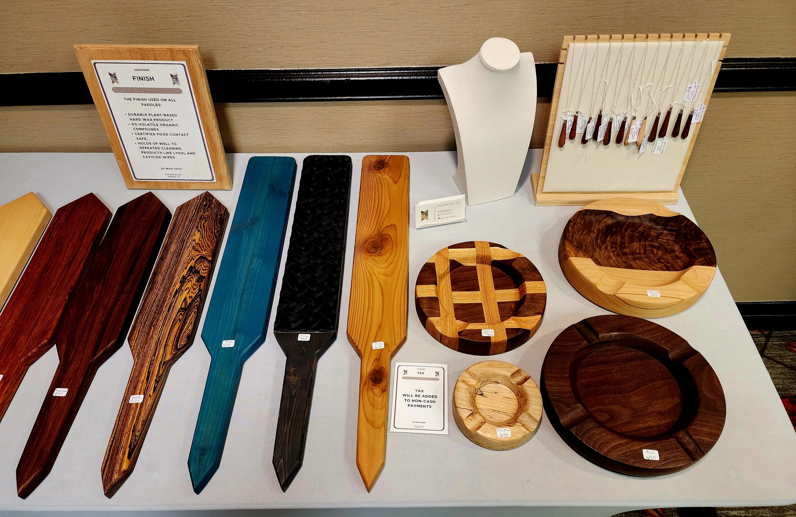 A vendor table at an outdoor event displaying handcrafted wooden paddles, canes, paracord whips, and other finely crafted wood products.