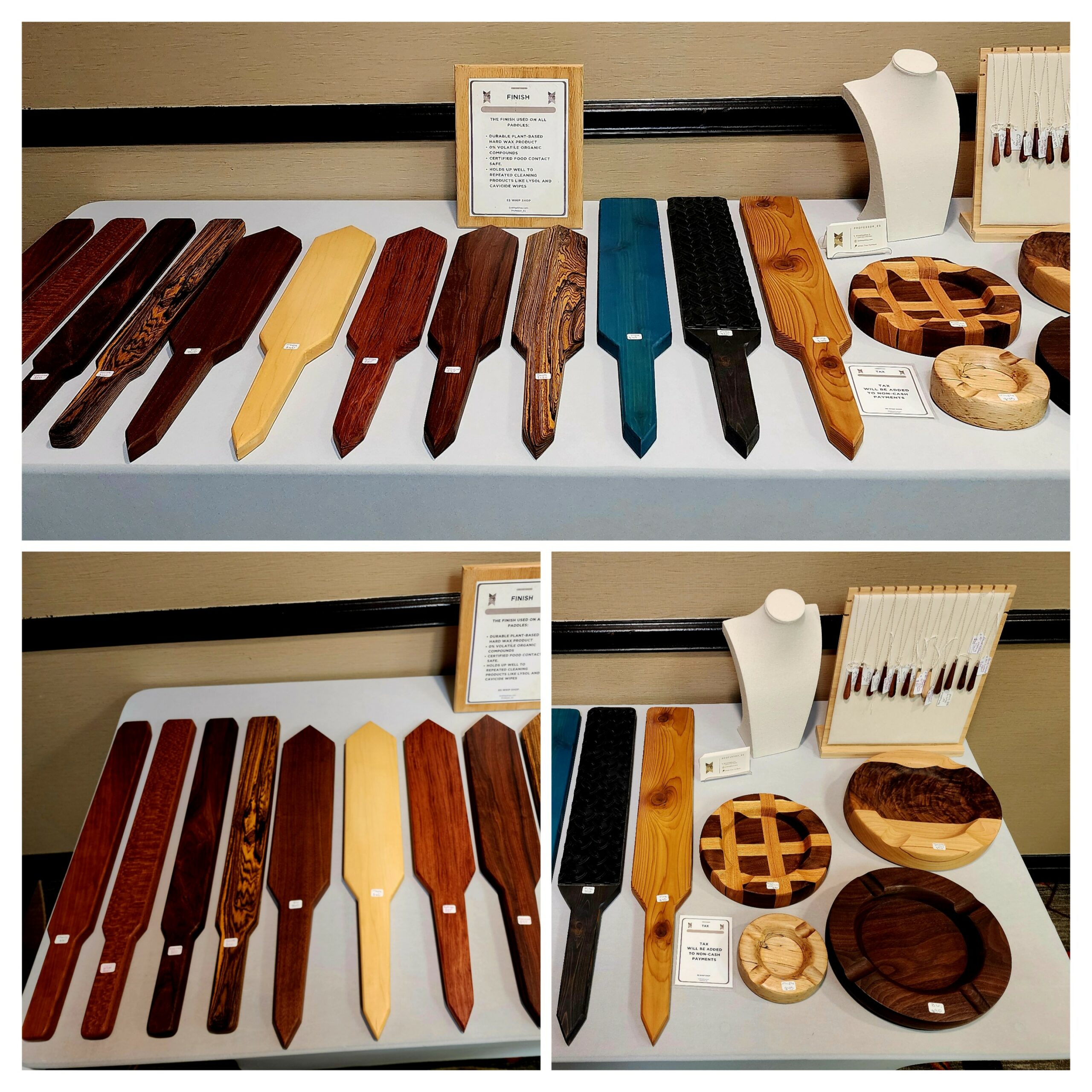 Handcrafted wooden paddles and ashtrays in progress, showcasing various exotic and domestic wood species with intricate finishes and unique designs.