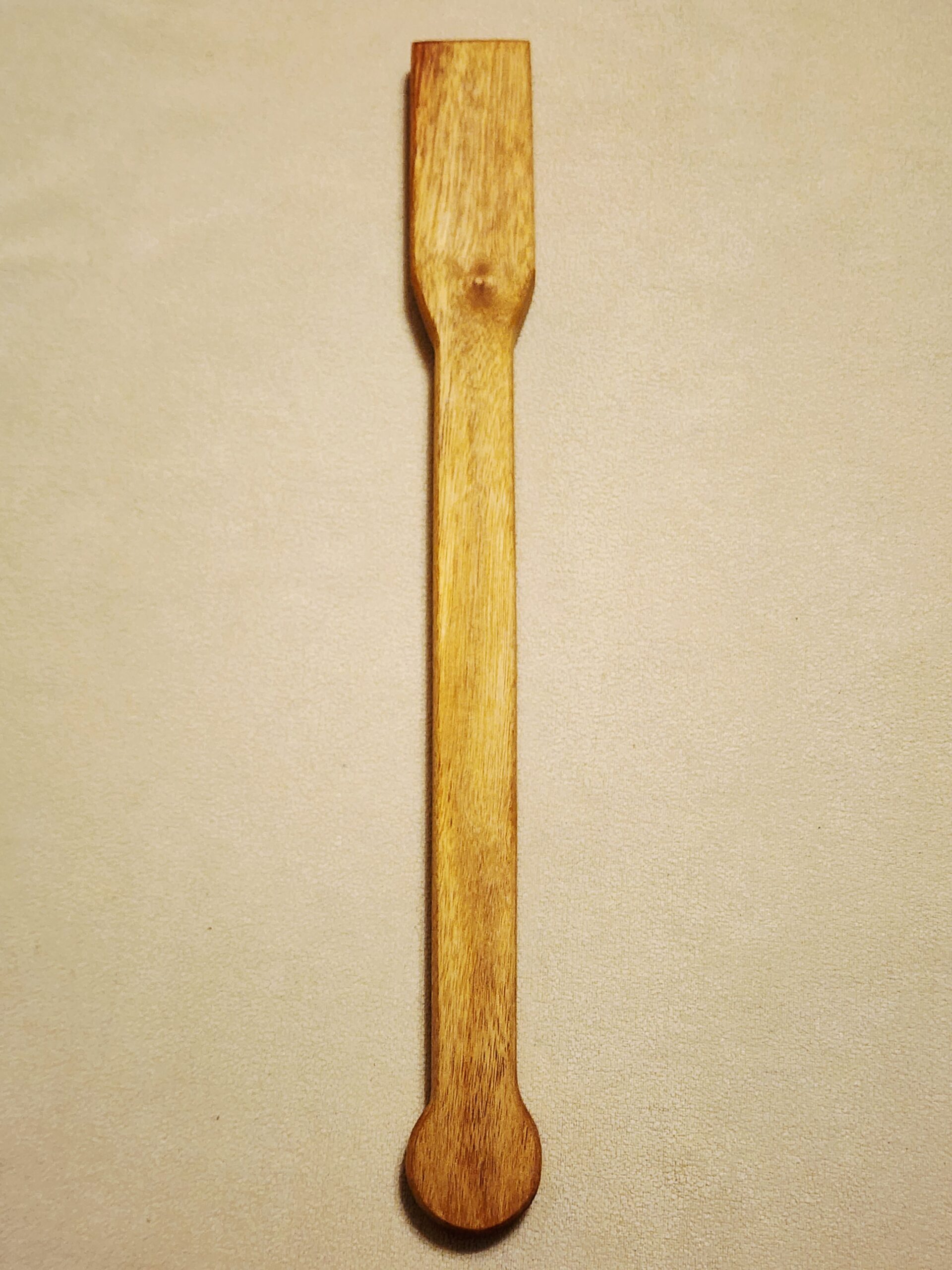 The narrow slapper-style design enhances control, delivering sharp, clean feedback with every impact. Canarywood’s smooth grain and natural hardness ensure an excellent finish, while the strong red streaks throughout the wood give this piece an unmistakable visual presence. Individually crafted without CNC machinery, this paddle highlights both craftsmanship and the unique character of the wood.